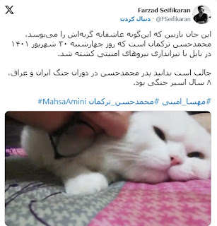 این جان نازنین که اینگونه عاشقانه گربهاش را میبوسد، محمدحسن ترکمان است که روز چهارشنبه ۳۰ شهریور ۱۴۰۱ در بابل با تیراندازی نیروهای امنیتی کشته شد.