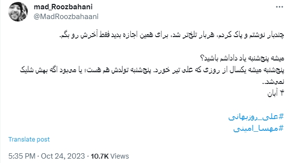 معلوم نیست چه تهدیدی کرده بودند که محمد بلافاصله توییت را حذف کرد و دیگر هیچ توییتی نگذاشت٬ بجز دو سه تا توییت این اواخر.